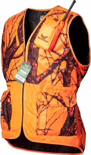 Hirviliivi Horns & Hoofs huomioliivi hirvenmetsästykseen. Sisäänvedettävä radiopuhelintasku ja pikkutasku vetuketjulla. Isot tarviketaskut edessä niissa paikat panoksille molemmin puolin.
