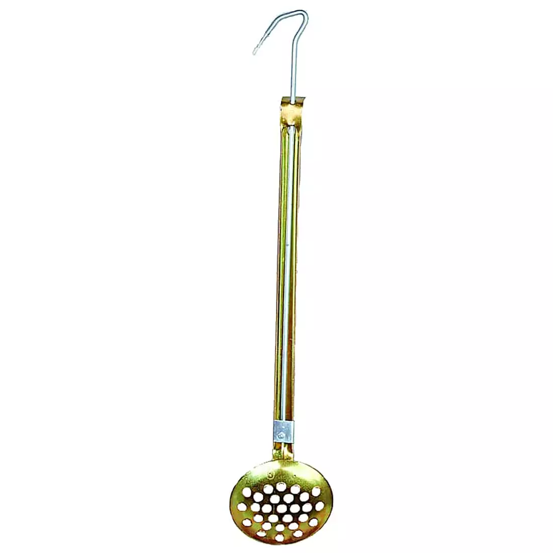 Metallista valmistettu kauha kestää käytössä. Toisessa päässä nostokoukku.