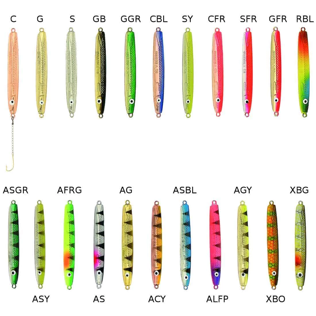 Kevyesti väriseväuintisen Sukkulan värikirjoassa löytyy 22 eri väriä, kolmessa koossa: 25mm, 35mm ja 50mm. Mukana ketjukoukku. Käytä kuvasuurennosta nähdäksesi paremmin.